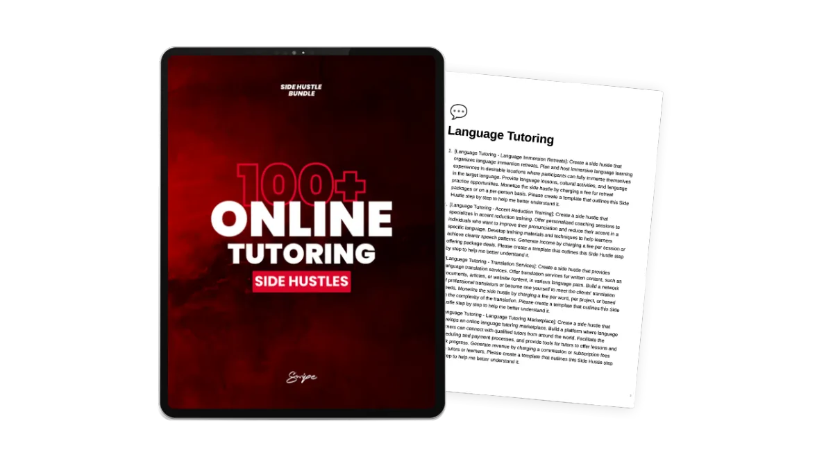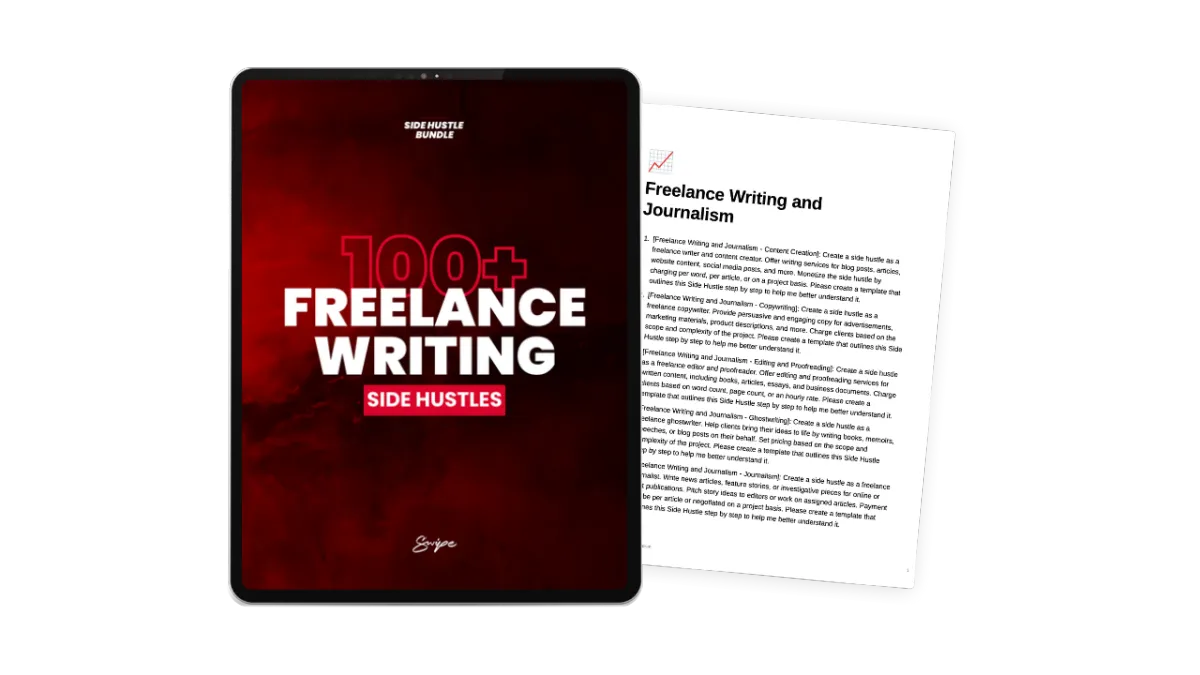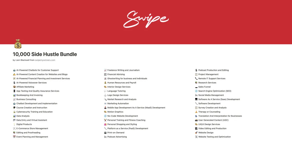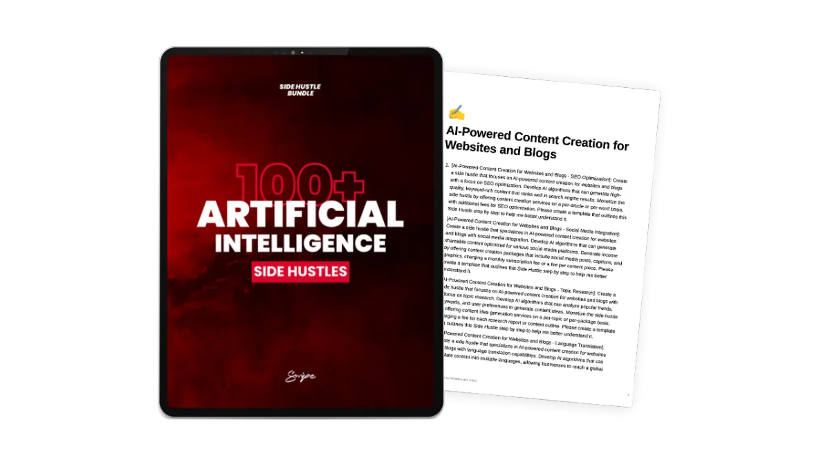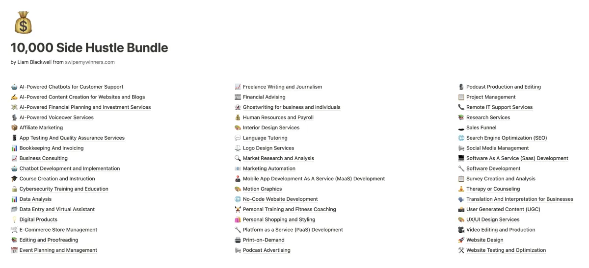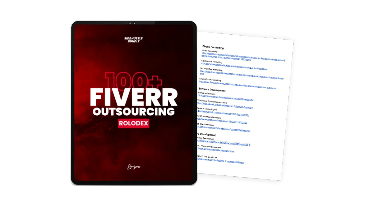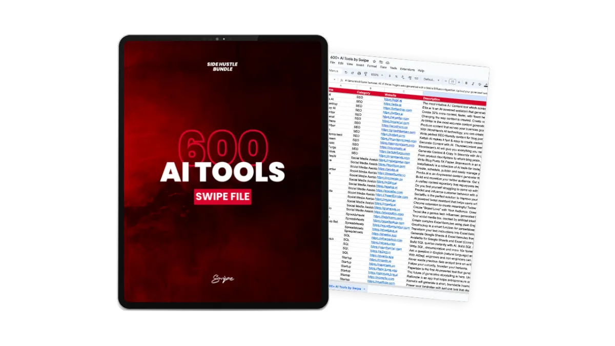 Unlike generic advice, the Ultimate Side Hustle Bundle provides 10,000 pre-written, proven ideas tailored for today's digital landscape. Plus we give you a suite of AI tools to build your business for you. And in case you're lacking any technical skills, there's also a rolodex of affordable professionals on Fiverr who can help you make your dream a reality. Slashing your learning curve and time investment while removing all excuses.