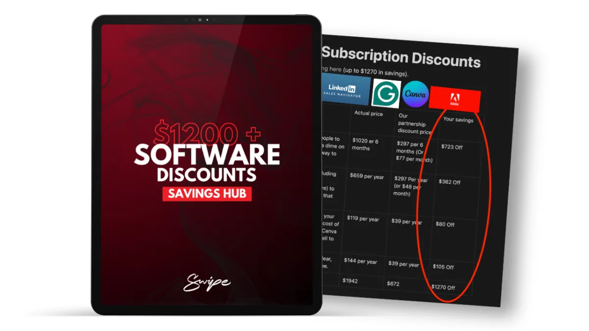 Use our partnership deals to save up to $1270 in software subscription costs on apps such as Canva, Adobe (all apps), Grammarly and Linkedin Sales Navigator